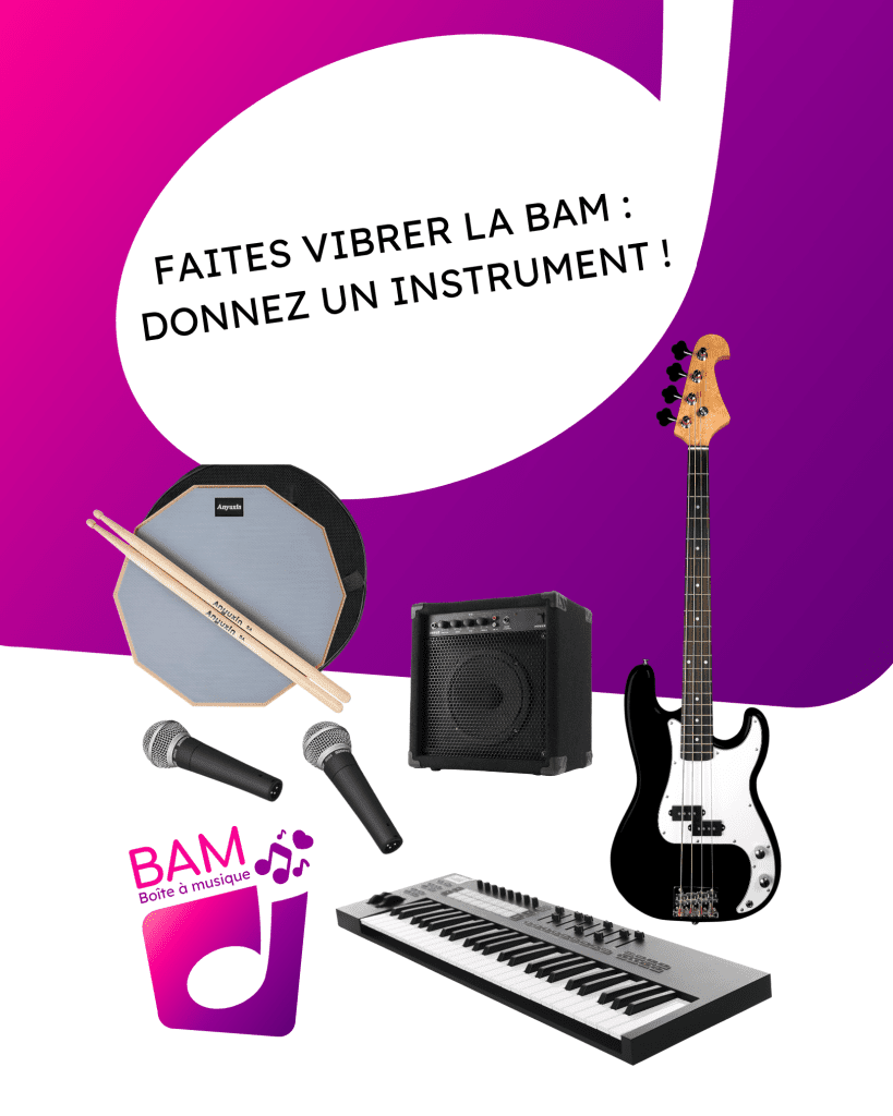 Aidez-nous à enrichir notre bibliothèque musicale : clavier électrique portable, guitare basse, amplificateur, microphone ou pad de pratique pour batterie.