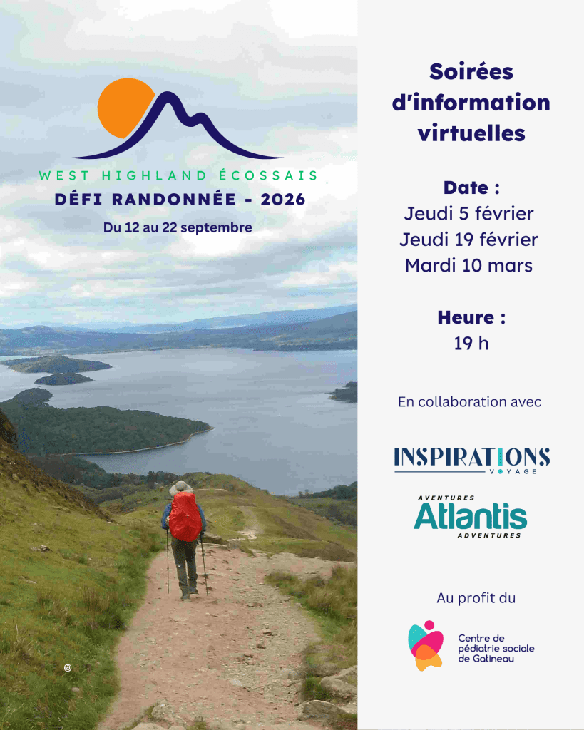 Du 12 au 22 septembre 2026, rejoignez le Défi Randonnée – West Highlands Écossais, en collaboration avec Inspirations Voyage et Aventures Atlantis, au profit du Centre de pédiatrie sociale de Gatineau.